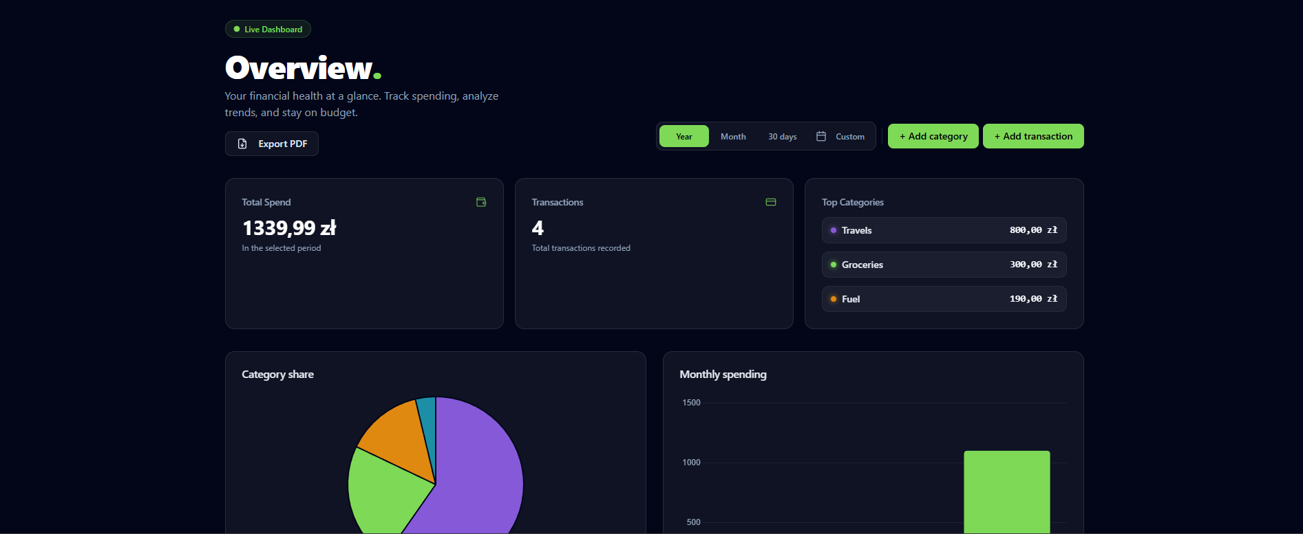One clean dashboard that gives you a complete overview of your financial habits, expenses, and trends across categories and months.